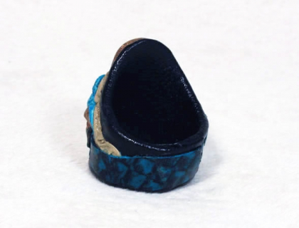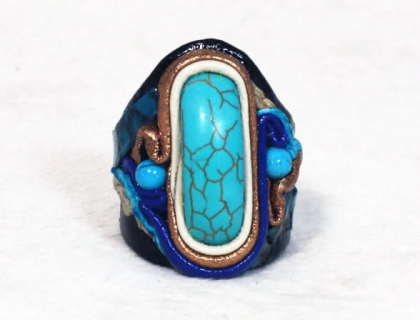 LEATHER is a familar material to most; though rarely will it be seen used in such a beautiful way. The designer needs virtuoso skill and patience to shape the natural leather by candlel. Leatherwork combined with SEMI-PRECIOUS STONES - TURQUOISE, makes for a quirky though harmonious ensemble: a real talking point whenever worn.