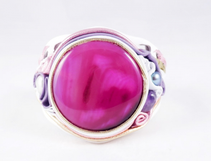 LEATHER is a familiar material to most ; though rarely will it be seen used in such a beautiful way. The designer artisan needs virtuoso skill and patience to shape the natural leather by candle. Leatherwork combined with SEMI-PRECIOUS STONES - AGATE, makes for a quirky though harmonious ensemble : a real talking point whenever worn.