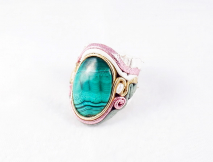 LEATHER is a familiar material to most ; though rarely will it be seen used in such a beautiful way. The designer needs virtuoso skill and patience to shape the natural leather by candle. Leatherwork combined with SEMI-PRECIOUS STONES -MALACHITE, makes for a quirky though harmonious ensemble : a real talking point whenever worn.