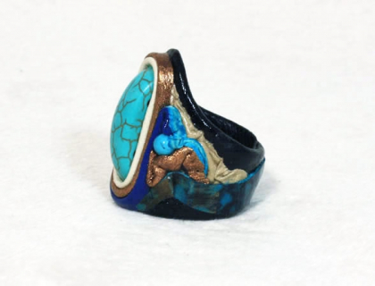 LEATHER is a familar material to most; though rarely will it be seen used in such a beautiful way. The designer needs virtuoso skill and patience to shape the natural leather by candlel. Leatherwork combined with SEMI-PRECIOUS STONES - TURQUOISE, makes for a quirky though harmonious ensemble: a real talking point whenever worn.