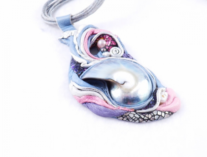 LEATHER is a familiar material to most ; though rarely will it be seen used in such a beautiful way. The designer needs virtuoso skill and patience to shape the natural leather by candle. Leatherwork combined with SEMI-PRECIOUS STONES -MOTHER OF PEARLS, makes for a quirky though harmonious ensemble : a real talking point whenever worn
