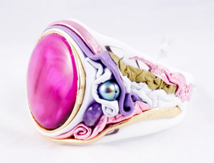 LEATHER is a familiar material to most ; though rarely will it be seen used in such a beautiful way. The designer artisan needs virtuoso skill and patience to shape the natural leather by candle. Leatherwork combined with SEMI-PRECIOUS STONES - AGATE, makes for a quirky though harmonious ensemble : a real talking point whenever worn.