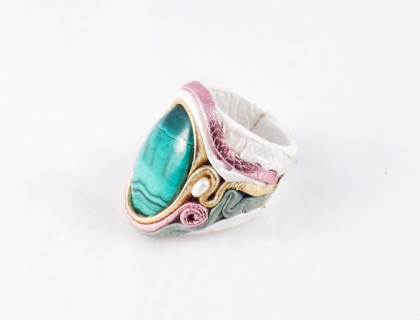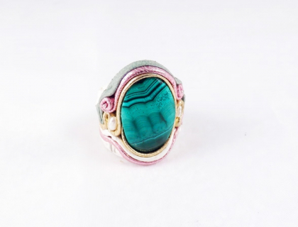 LEATHER is a familiar material to most ; though rarely will it be seen used in such a beautiful way. The designer needs virtuoso skill and patience to shape the natural leather by candle. Leatherwork combined with SEMI-PRECIOUS STONES -MALACHITE, makes for a quirky though harmonious ensemble : a real talking point whenever worn.
