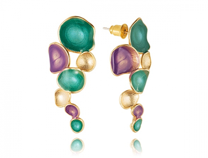 Molten [long] leaf earrings; hand painted with vibrant -Turquoise and Violet colours to bring out your natural beauty. 17mm x 38 mm. Gold plated.